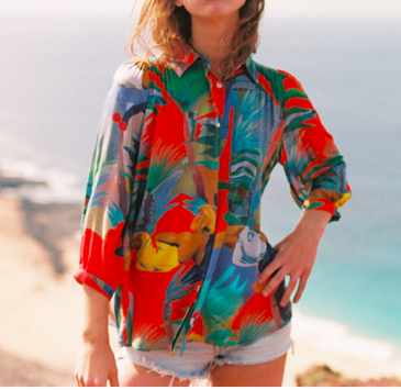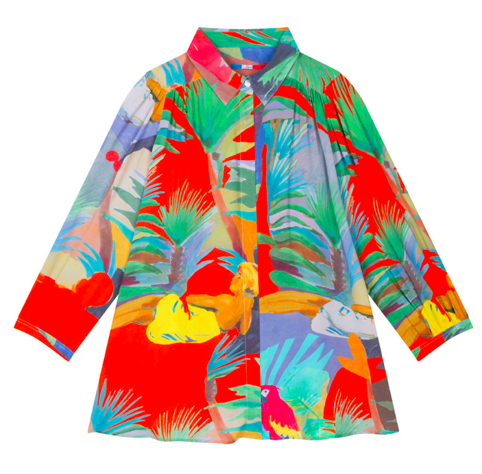 Imprimé tropical et personnage féminin sur fond rouge. Le nom de ce dessin est « KOH KOOD ».