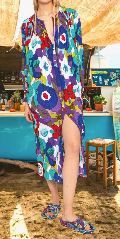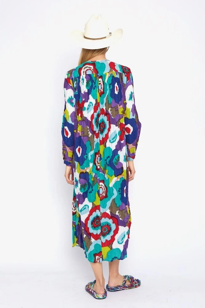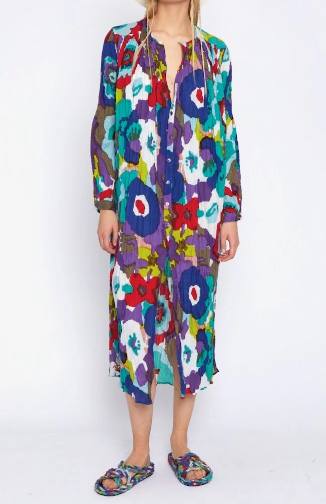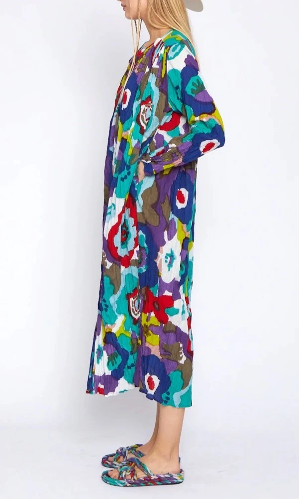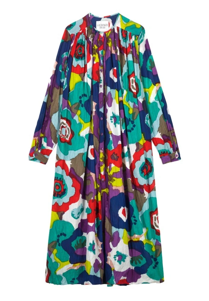 CIGARETTE robe Laurence Bras Robe mi longue en voile de coton imprimé grosses fleurs et formes abstraites multicolores. Manches longues et resserrées aux poignets. Boutonnage tout le long devant. Poches laterales. Composition: 100% coton Livraison offerte en France métropolitaine à partir de 150€ d’achat