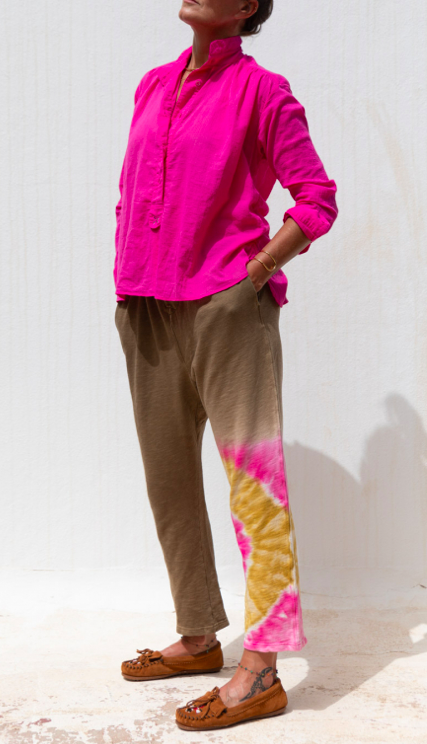 Pantalon de jogging forme saroual en coton molleton sub yarn imprimé tie and dye coloris tobacco.