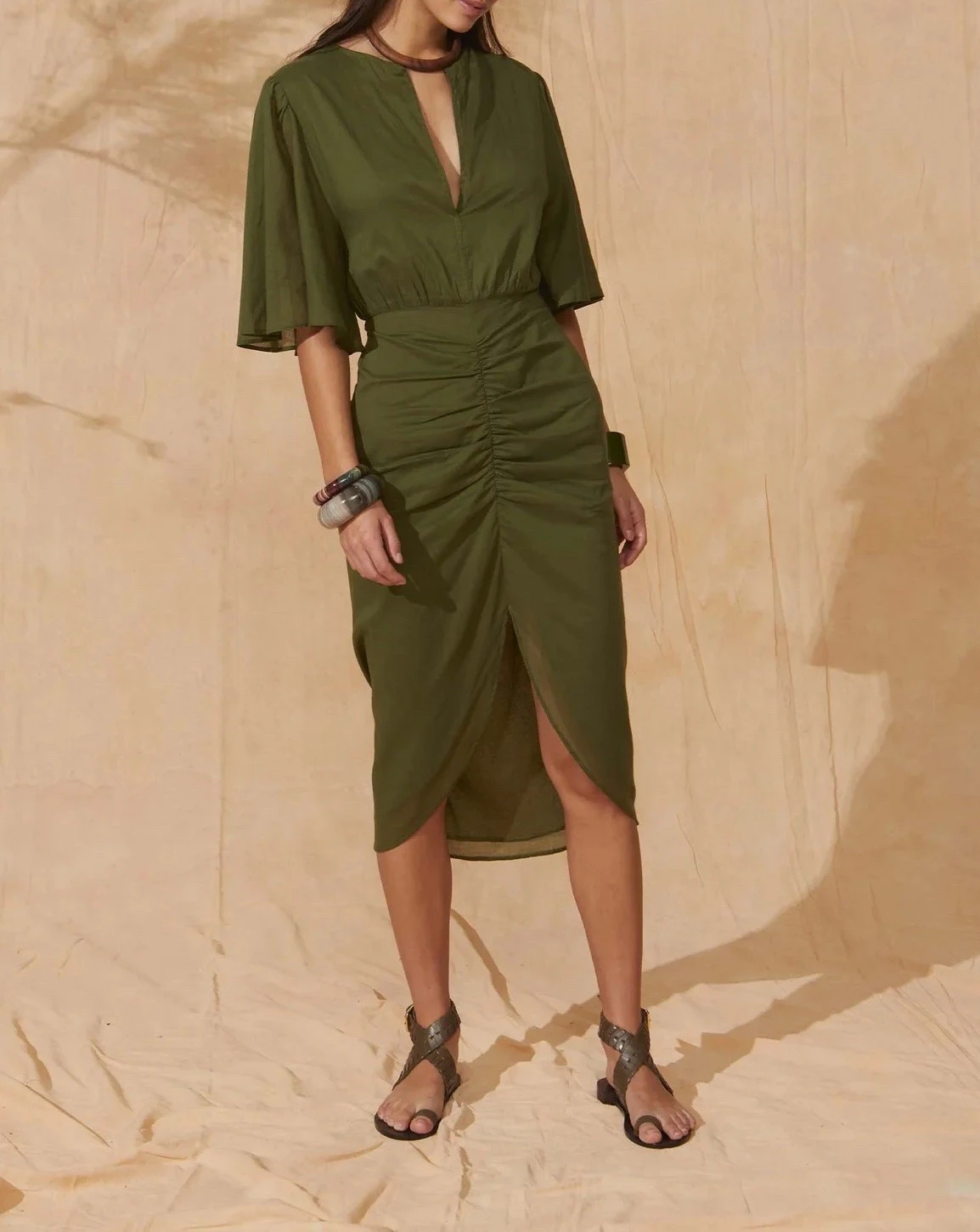 BARBARA robe MARE DI LATTE Robe mi-longue, manches 3/4 et larges, décolleté en V avec petites attaches pour l’ajuster.