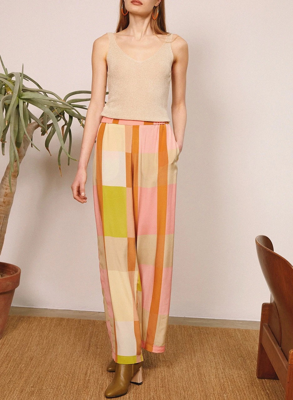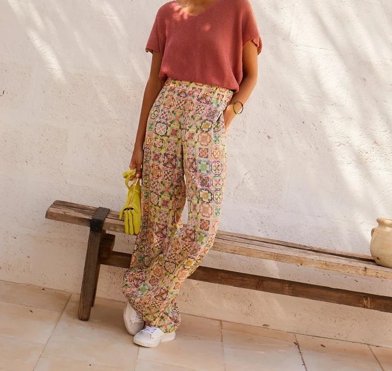 Pantalon en crêpe de chine de soie imprimée multicolore, vert.